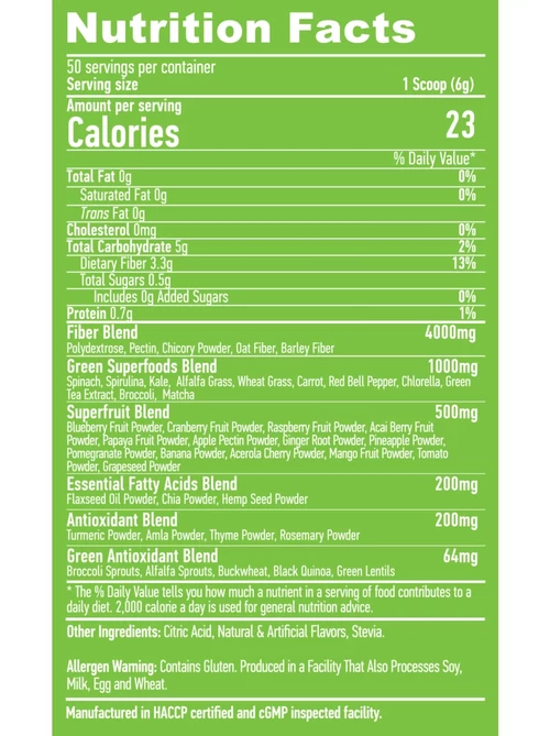 Összetevők: Komplex rost, cikória, kókusz, zab- és kókuszrost, spirulina, spenót, cékla, papaya, zöld tea, brokkoli, chlorella, gyömbér.