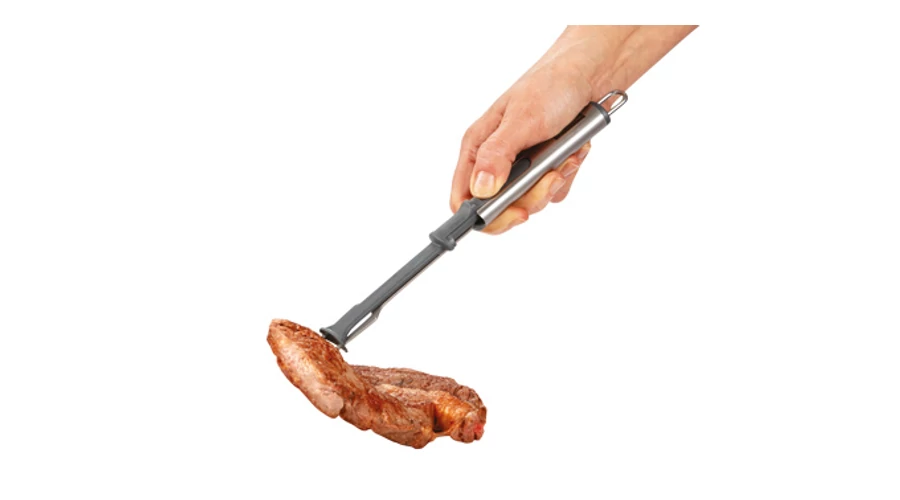 A mechanikus lehúzóval rendelkező szervírozóvilla segítségével biztonságosan tálalhatók a steakek, szeletelt sajtok, szárnyasok stb. Első osztályú rozsdamentes acélból és hőálló műanyagból (210 °C) készült. Folyó víz alatt tisztítsa, ne mossa mosogatógépben. 3 év garancia. | |