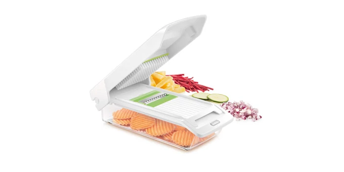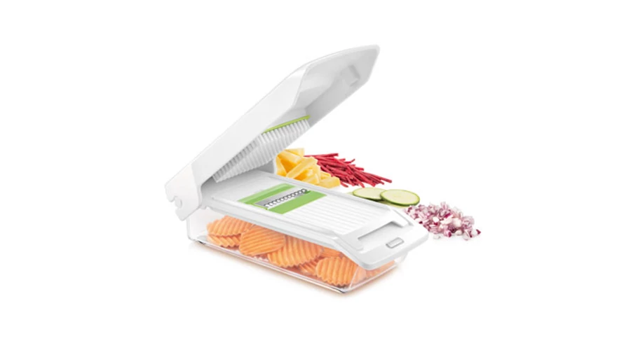 Kiválóan alkalmas gyümölcsök és zöldségek kockára vagy hasábokra vágására, valamint egyszerű lereszelésére. A kényelmes használatot nyolc cserélhető penge, tágas tárolóedény és biztonsági fogantyú biztosítja. Prémium rozsdamentes acélból és strapabíró, csúszásmentes bevonatú műanyagból készült. Kis helyen is elfér. Mosogatógépben tisztítható. 3 év garancia. | |