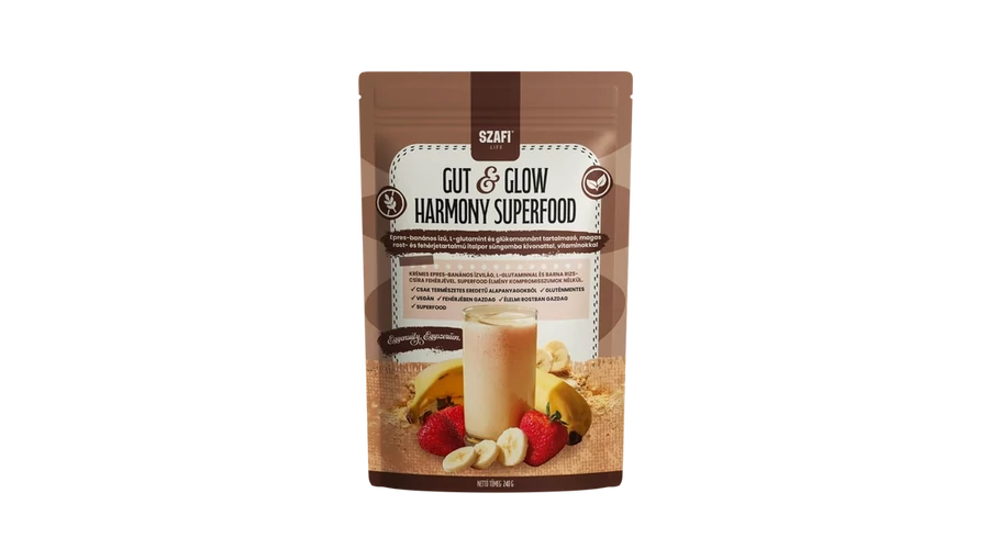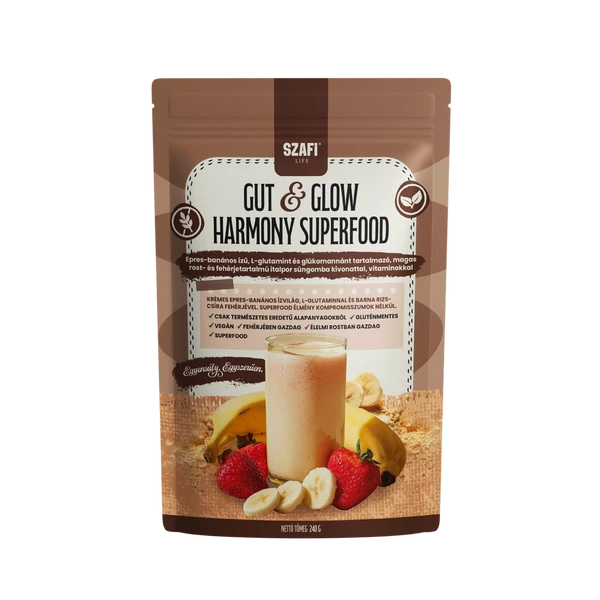 A Szafi Life Gut & Glow Harmony superfood italpor támogathatja a bélflóra egyensúlyát és a bőr szépségét, valamint hozzájárul a testtömeg csökkenéshez.* Gluténmentes, süngombát, L-glutamint, rizscsíra fehérjét és antioxidáns gyümölcsporokat tartalmaz.Krémes epres-banános ízvilág, L-glutaminnal és barna rizscsíra fehérjével.
