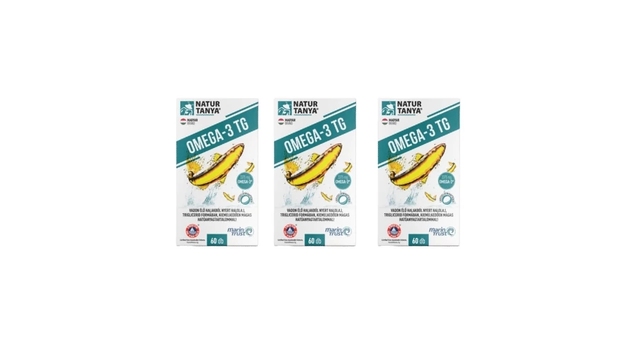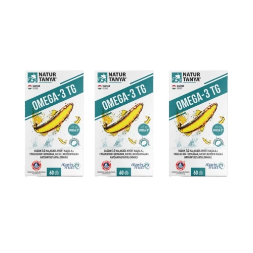 A csomag 3 db Natur Tanya® OMEGA-3 TG - Vadvízi halolaj, 3375 mg Omega-3 zsírsav tartalom, triglicerid formában-ot tartalmaz. OMEGA-3 TG Vadvízi halolaj, 3375 mg Omega-3 zsírsav tartalommal, triglicerid formában. Termékünket úgy fejlesztettük ki, hogy nagy mennyiségben tartalmazza az aktív hatóanyagokat 75%-os Omega-3 zsírsav tartalommal, természetes triglicerid formában. Az általunk felhasznált halolaj fenntartható halászatból származik, ezt a MarinTrust és Friends of the Sea logó/certifikáció biztosítja. A Natur Tanya® OMEGA-3 TG fogyasztása kifejezetten ajánlott fogyókúrázók étrendi kiegészítésére, sportolóknak, kisbabát tervező hölgyeknek, valamint terhesség és szoptatás ideje alatt is.